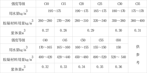 注:①对于路面、地坪等坍落度要求较低时,用水量可以降低10kg/m3。